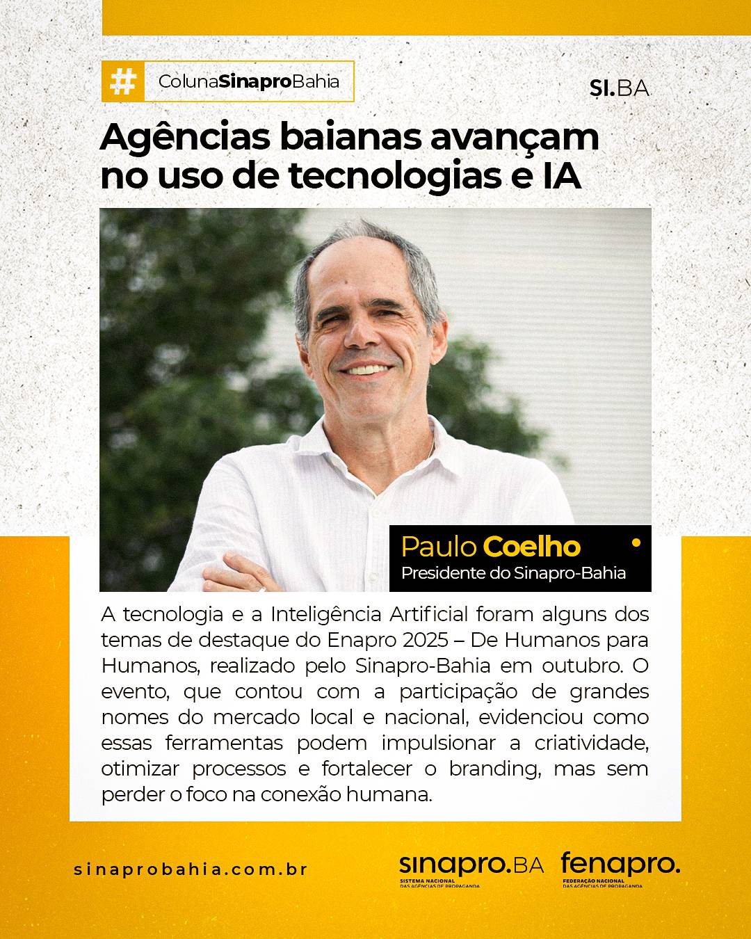 A tecnologia e a Inteligência Artificial foram alguns dos temas de destaque do Enapro 2025 – De Humanos para Humanos, realizado pelo Sinapro-Bahia em outubro. O evento, que contou com a participação de grandes nomes do mercado local e nacional, evidenciou como essas ferramentas podem impulsionar a criatividade, otimizar processos e fortalecer o branding, mas sem perder o foco na conexão humana.